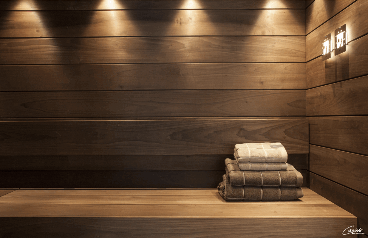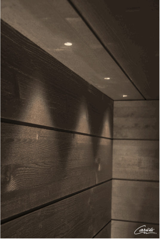 Projektoren kan installeres inne i badstuen, under benkene. Maksimal monteringshøyde er 70 cm fra gulvet.