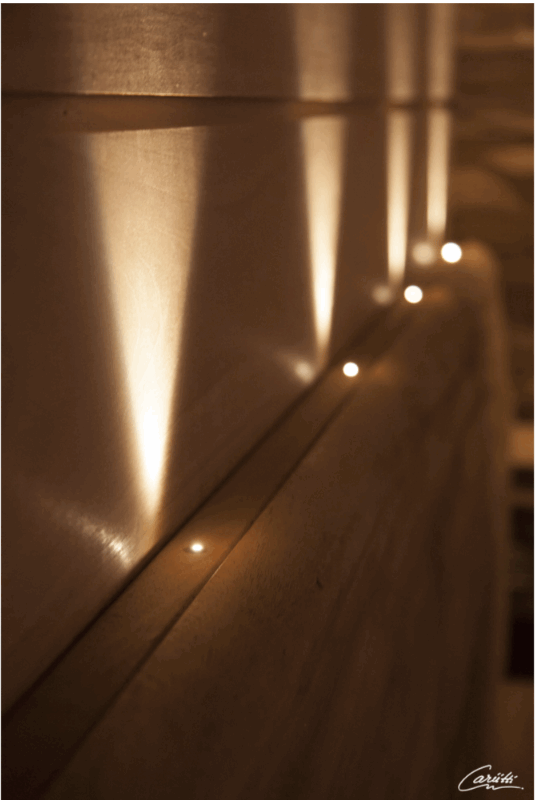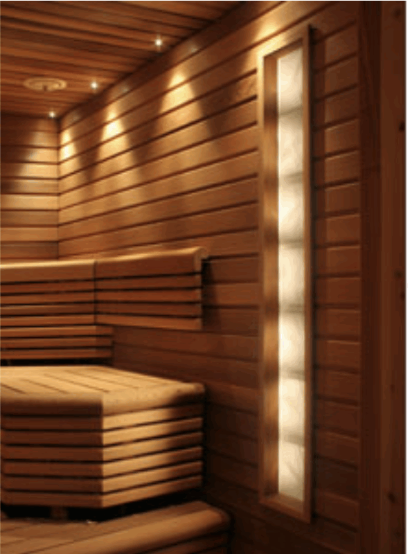 Det komplette installasjonsklare settet inkluderer en LED-projektor IP55, 16 glassfiber og en komfyrlinse. Projektoren kan installeres inne i badstuen, under benkene.