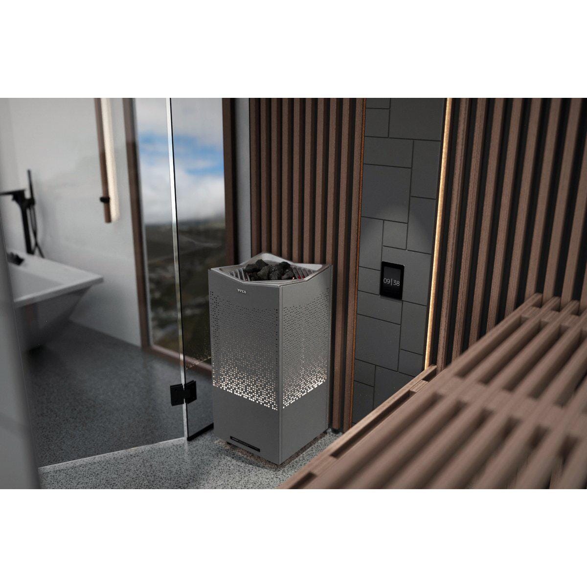 Den gulvstående badstuovnen har et symmetrisk design kombinert med et elegant lysmønster som kaster en varm glød over rommet og skaper en rolig og avslappende atmosfære. Den iøynefallende Crown-grillen gir optimal luftstrøm og varmesirkulasjon gjennom badstuen, og sikrer at du får fullt utbytte av enhetens teknologi.
