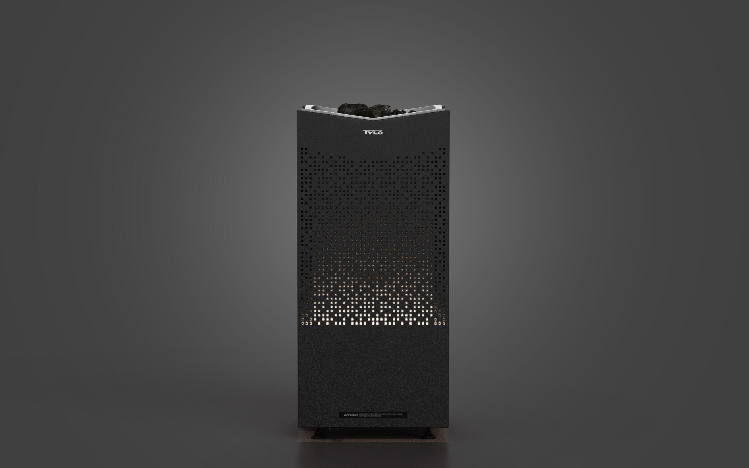 Den gulvstående badstuovnen har et symmetrisk design kombinert med et elegant lysmønster som kaster en varm glød over rommet og skaper en rolig og avslappende atmosfære. Den iøynefallende Crown-grillen gir optimal luftstrøm og varmesirkulasjon gjennom badstuen, og sikrer at du får fullt utbytte av enhetens teknologi.