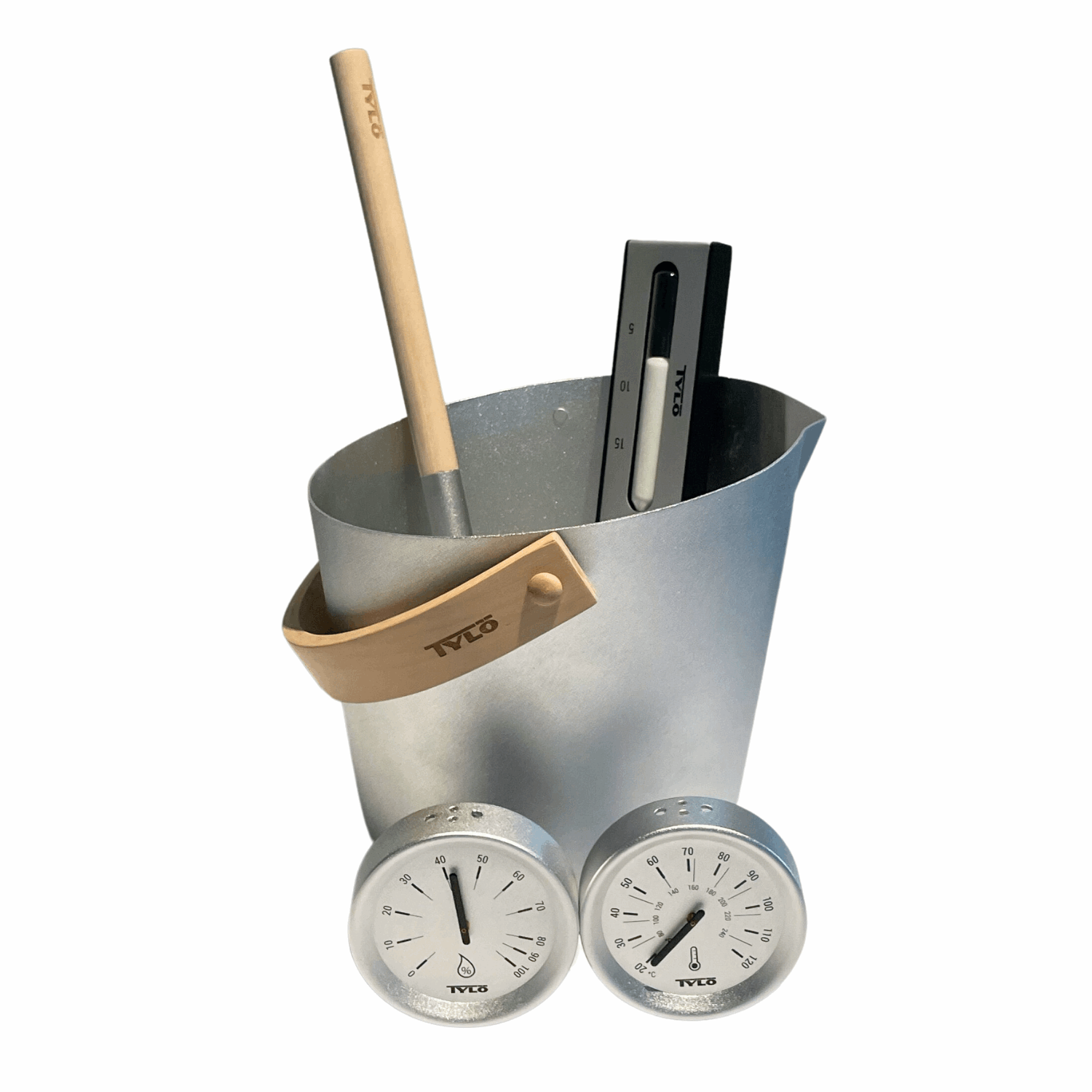 Gaveeske Brilliant Sølv. som inneholder øse, bøtte, hygrometer, termometer og timeglass i stilig design som gir badstuen din et moderne preg.