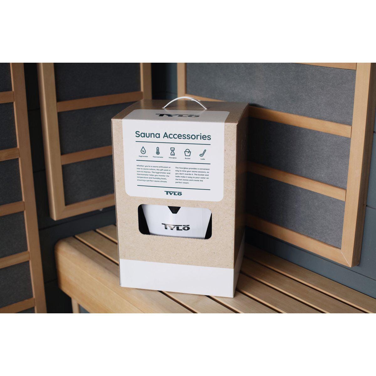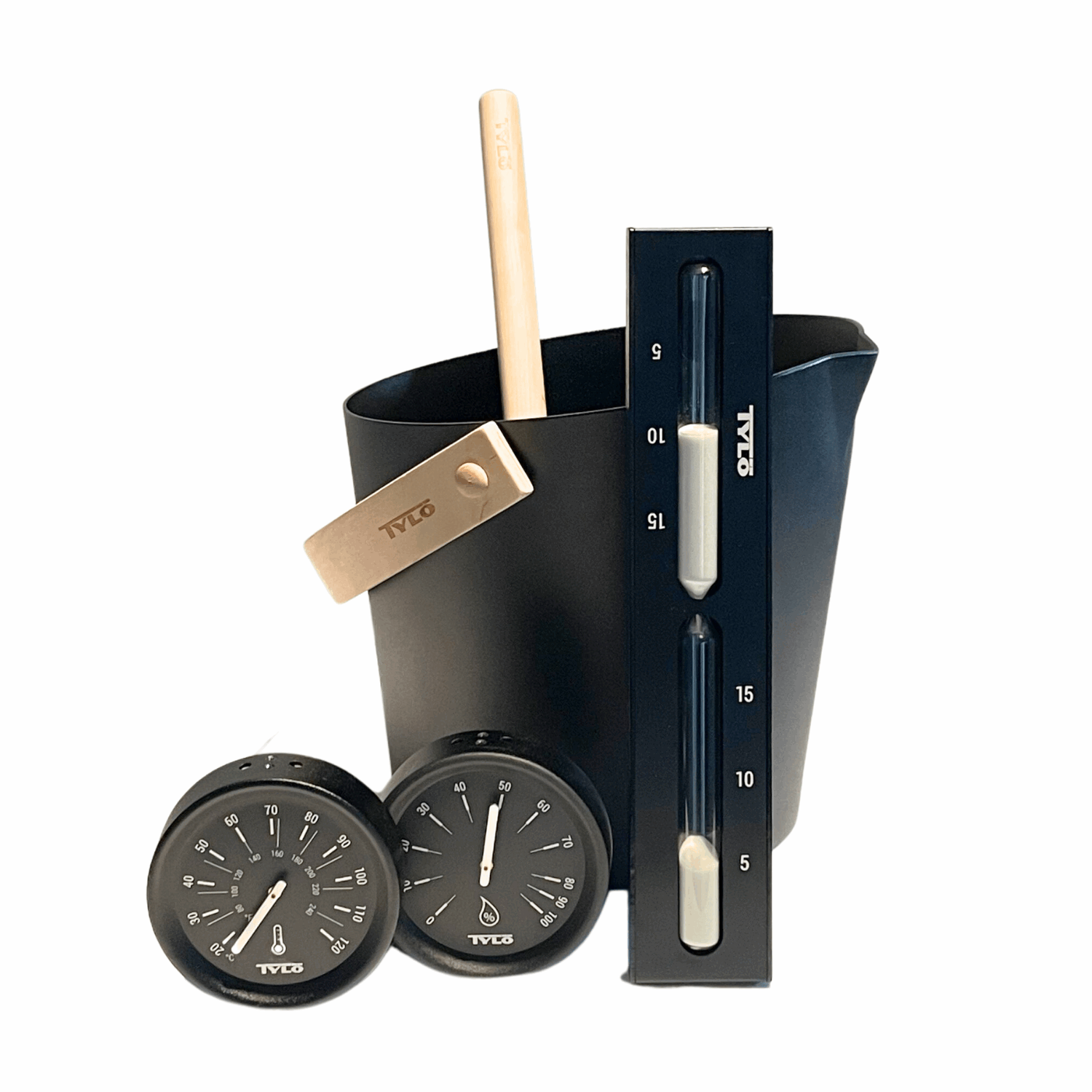 Gaveeske Brilliant Svart. som inneholder øse, bøtte, hygrometer, termometer og timeglass i stilig design som gir badstuen din et moderne preg.