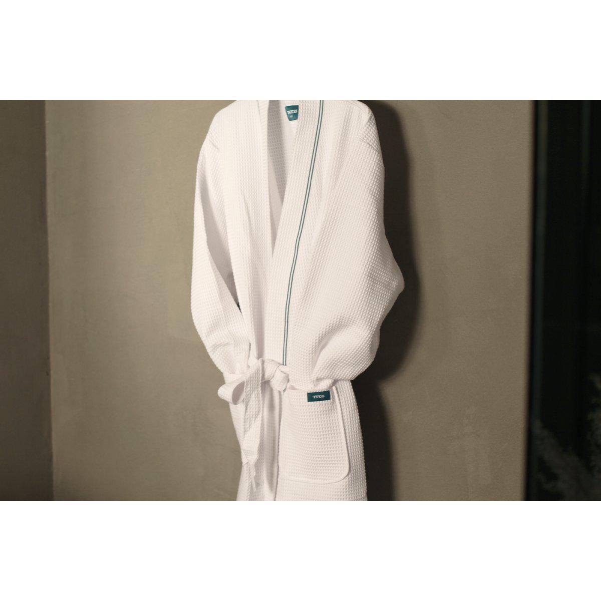 En hvit morgenkåpe i en myk. vaffelvevd bomullsblanding. Morgenkåpen har sjøblå kontraststriper langs kragen og leveres i en luksuriøs oppbevaringspose i samme vaffelvevde materiale.